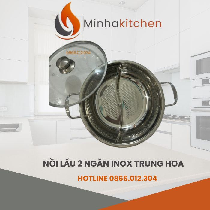 Nồi ăn lẩu 2 ngăn giá tốt là loại nồi inox tròn D30cm, có thiết kế chia đôi lòng nồi bằng vách ngăn inox liền khối, giúp người dùng có thể nấu hai loại nước lẩu khác nhau cùng lúc — ví dụ như lẩu Thái cay và lẩu nấm thanh ngọt.